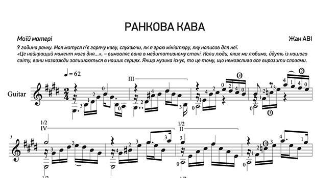 Jean Avy's composition "Morning coffee" for solo guitar published in the magazine "Guitar in Ukraine" N°18, 2025.